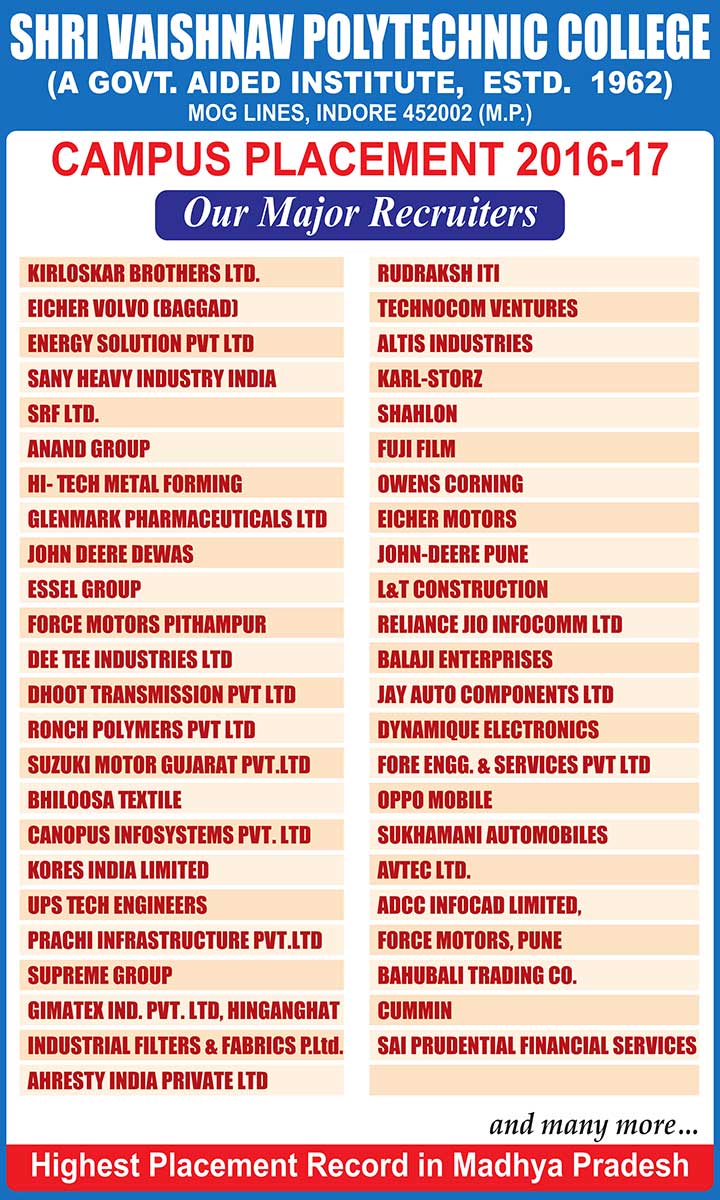 Shri Vaishnav Polytechnic, Indore pioneered campus placement in Central India by bringing corporates for the students of its first batch in 1998. The Group, carved a niche for itself in the corporate world and has lately become a synonym for campus placement. Some of the world's Top IT and Fortune 500 companies have made Oriental as the nodal center for their campus selection activity in the State of M.P as well as Chattisgarh. Students have been given lucrative packages by renowned companies..